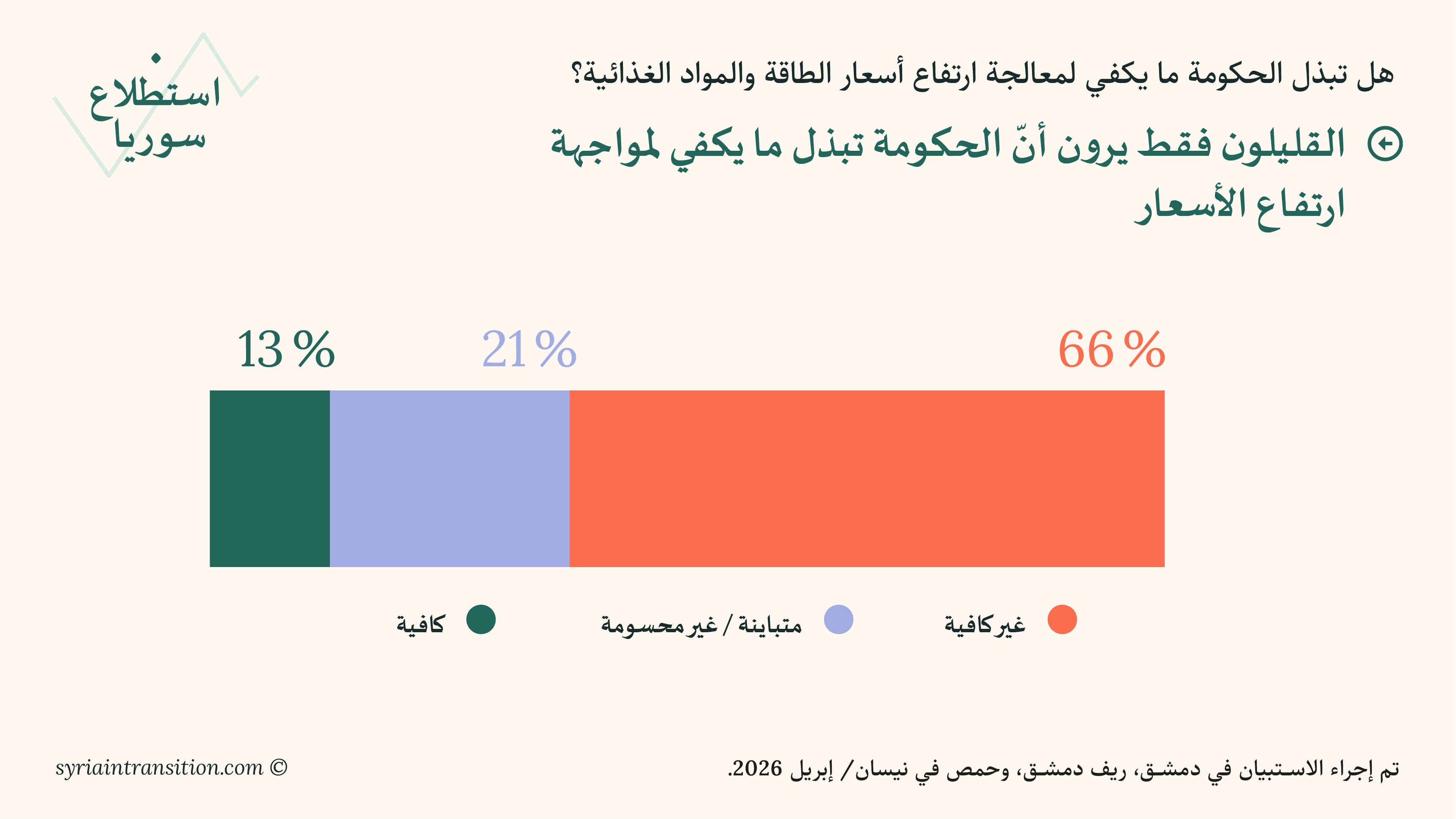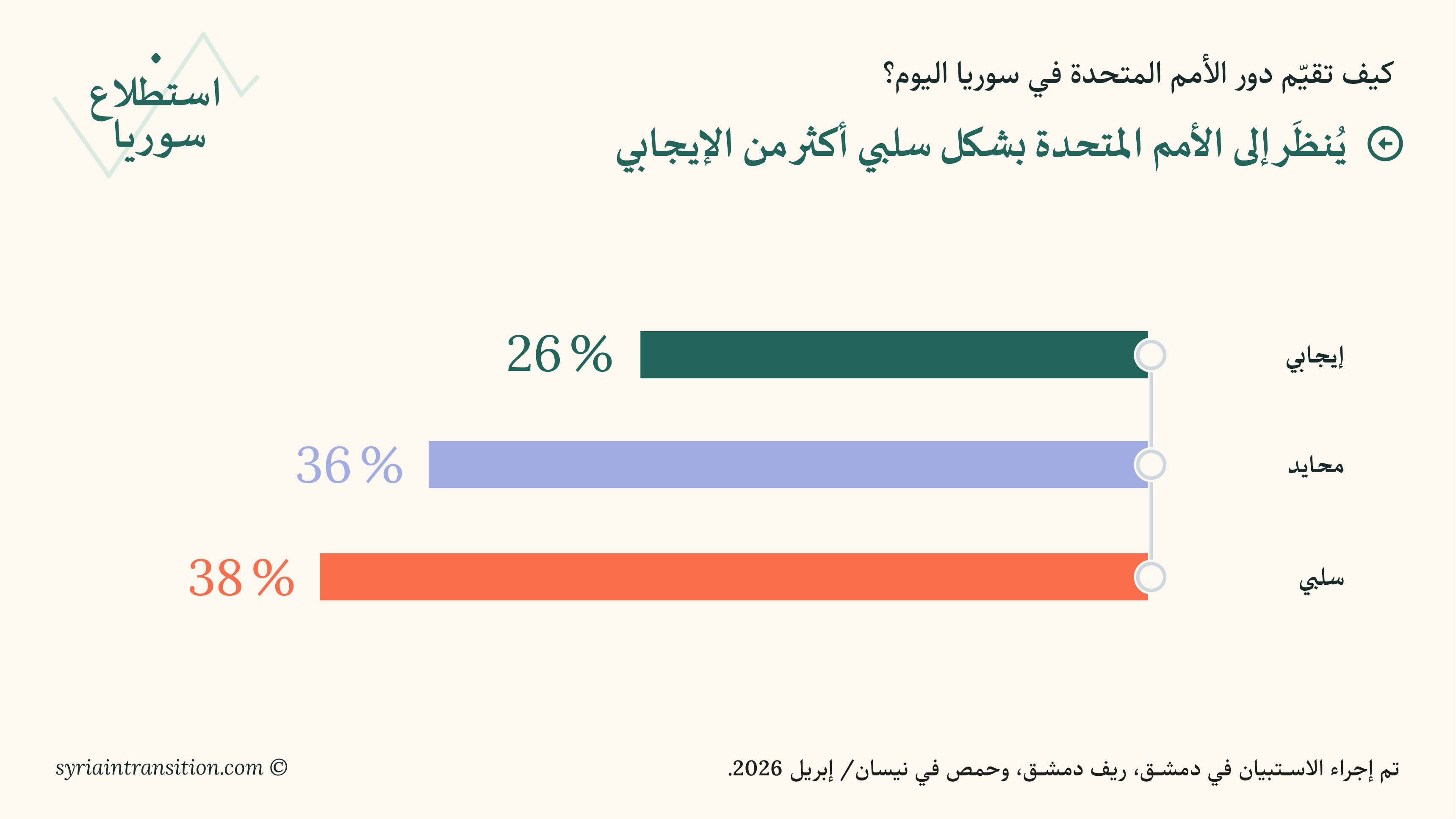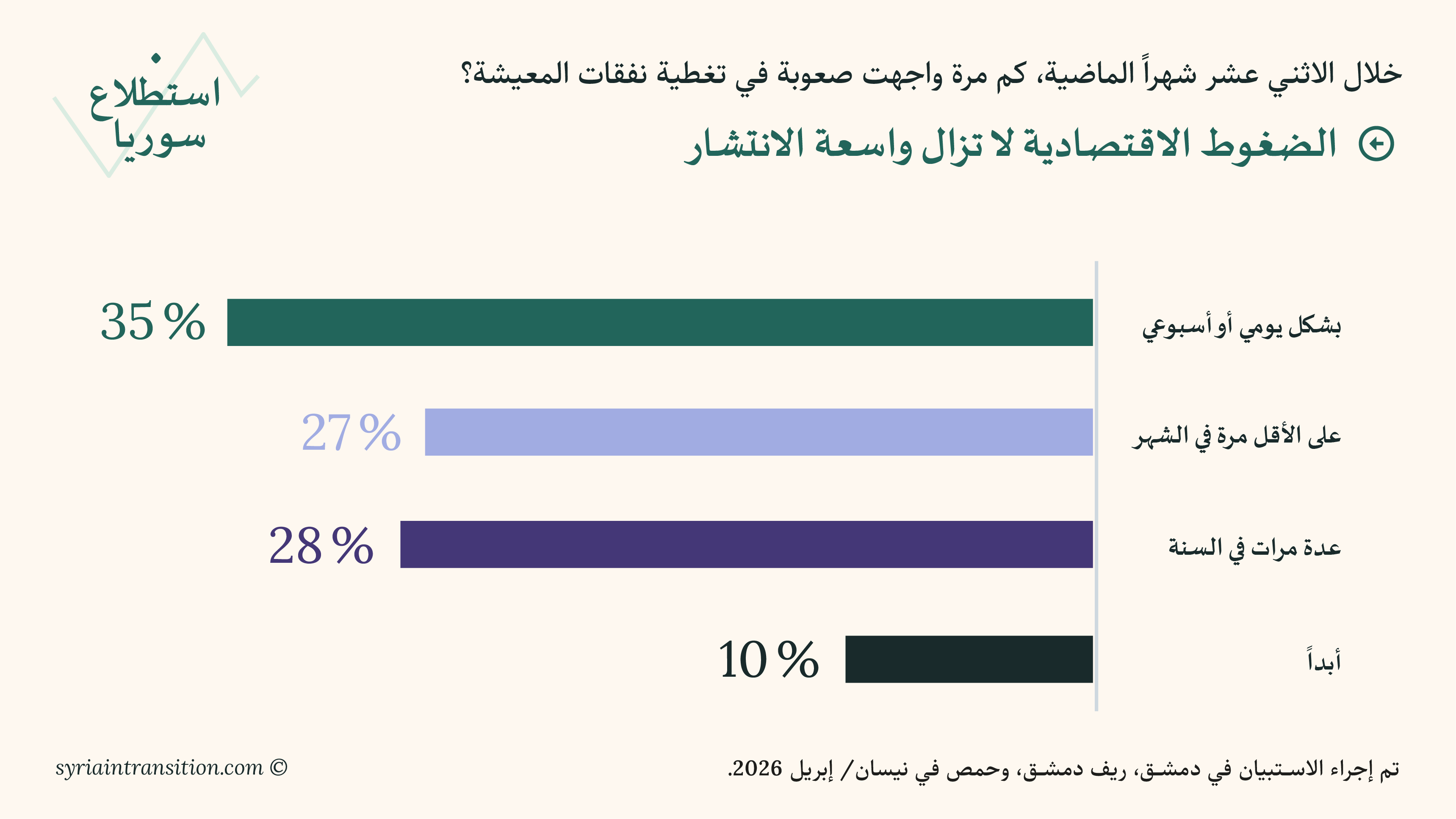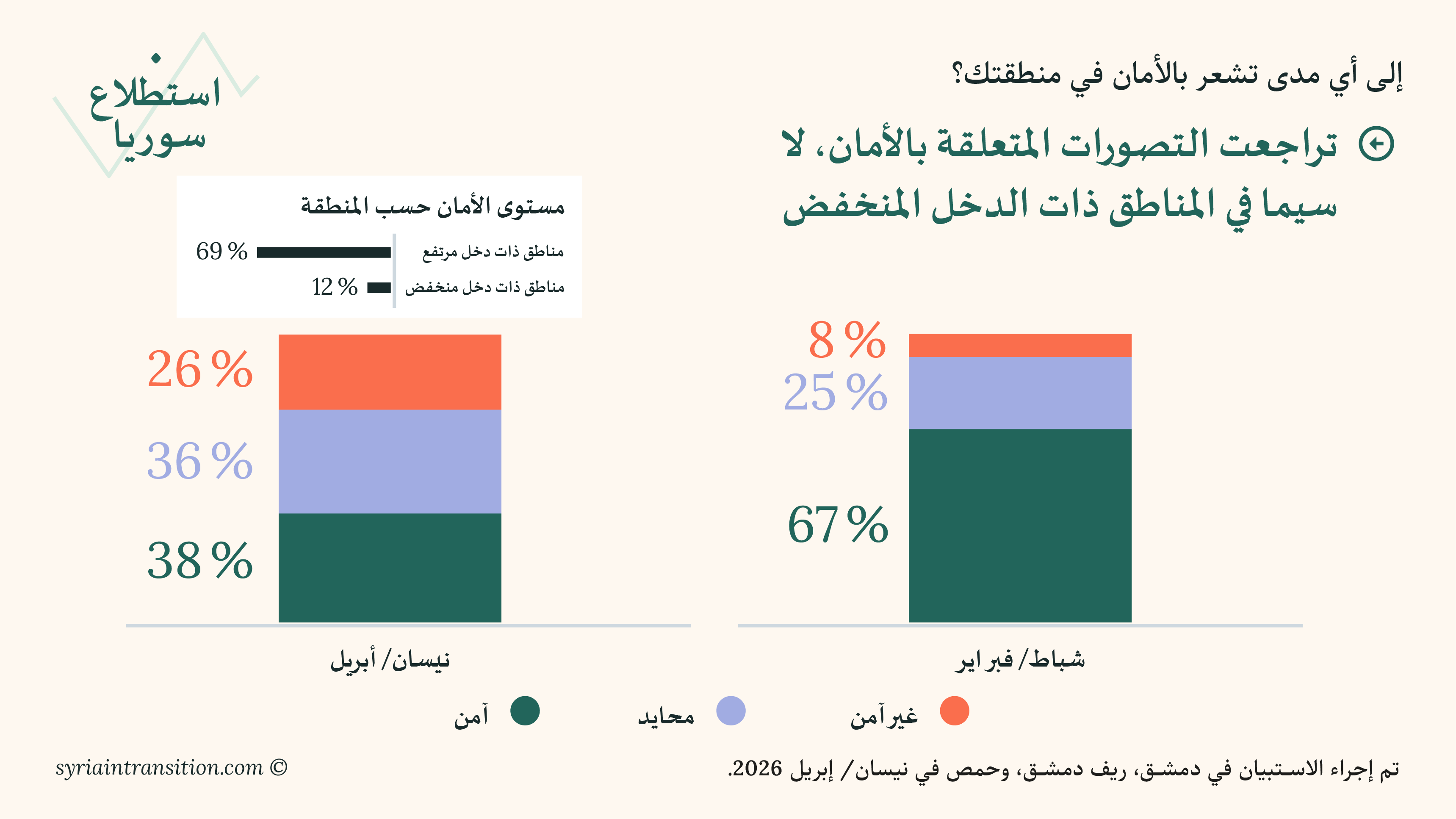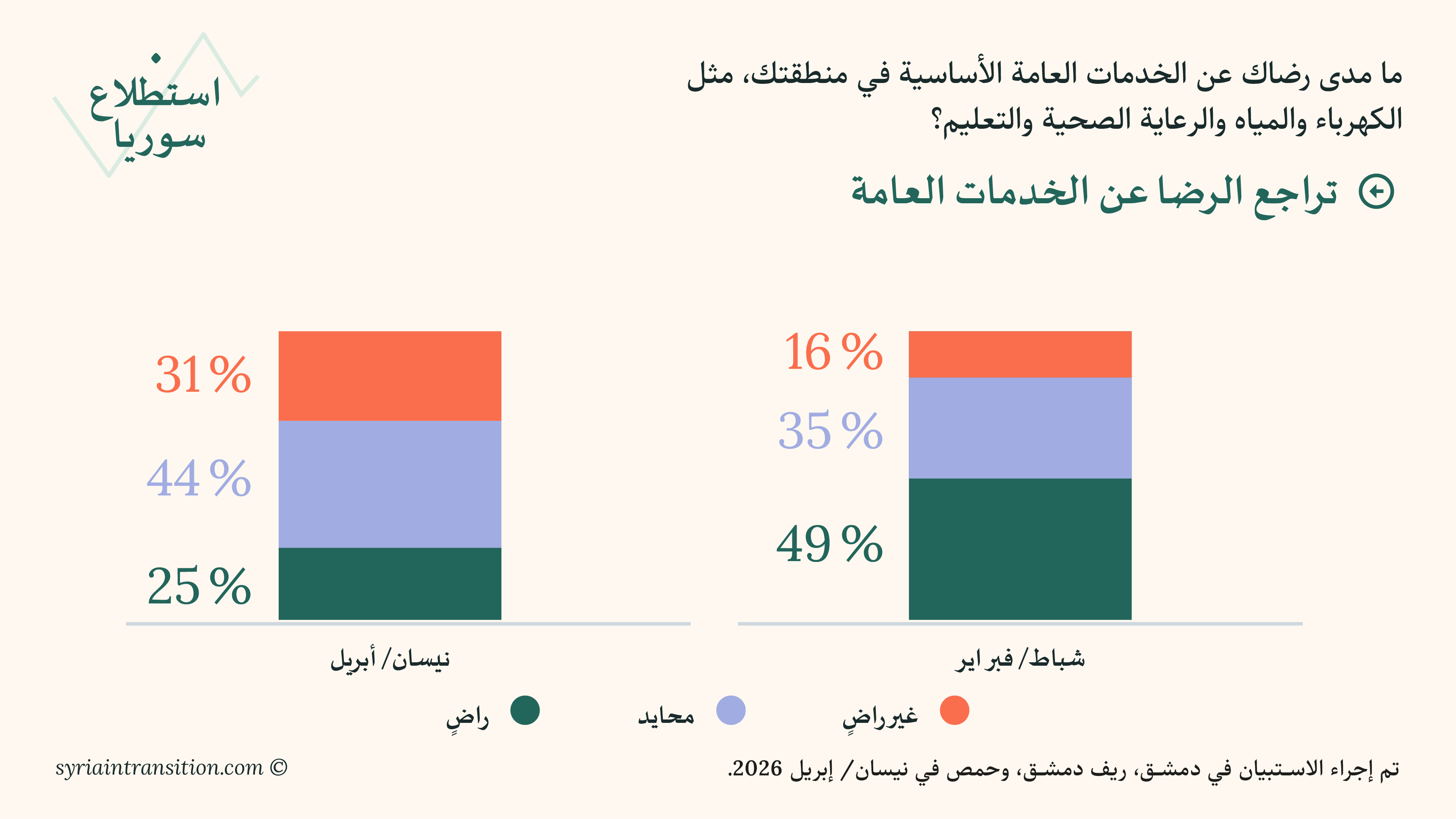 مرحباً بكم في جولة نيسان/أبريل من استطلاع سوريا. يعرض هذا العدد نتائج استبيانات أُجريت في دمشق وريف دمشق وحمص في منتصف نيسان/أبريل 2026، وتبحث في كيفية تقييم السكان لظروفهم المعيشية، وأداء الحكومة، والتطورات السياسية الأخيرة.