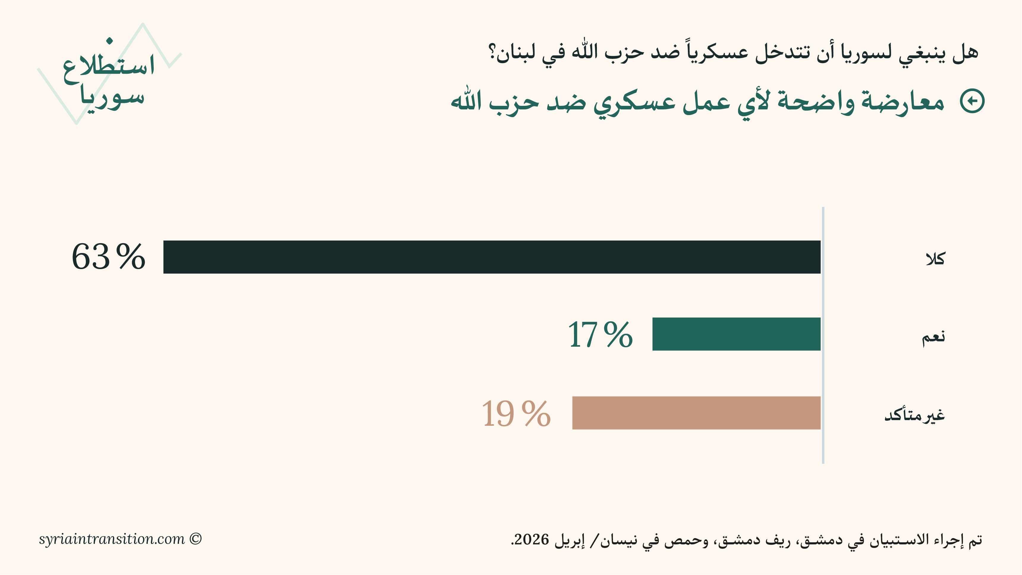 2. في حين تنقسم الآراء بشأن الحرب على إيران، يبرز توافق أوضح بشأن ما إذا كان ينبغي لسوريا الانضمام إليها. إذ تعارض أغلبية تبلغ 63 في المئة أي تدخل عسكري سوري في لبنان، فيما يؤيد ذلك 17 في المئة فقط. ويبقى نحو واحد من كل خمسة غير متأكدين.