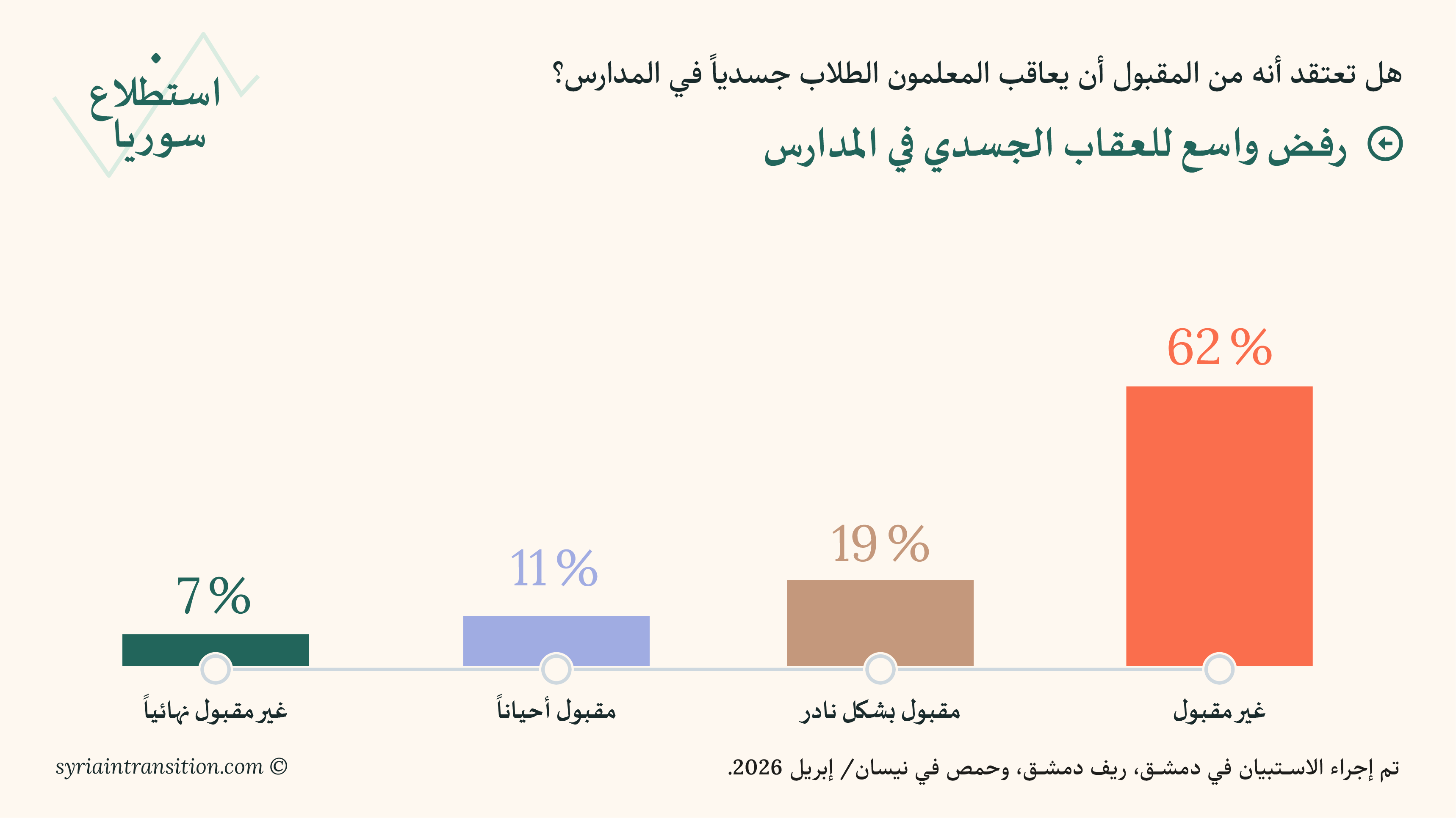 10. في ظل خضوع النظام التعليمي في سوريا للإصلاح، تعكس المواقف من الانضباط تغيراً في المعايير السائدة. وتقول أغلبية تبلغ 62 في المئة أنّ العقاب الجسدي في المدارس غير مقبول إطلاقاً. فيما يعبّر آخرون عن قبول مشروط، إذ تقول نسب أصغر إنه مقبول في بعض الظروف أو جميعها. ويشكّل هذا السؤال جزءاً من سلسلة مرتقبة حول إصلاح التعليم في «سوريا المتجدّدة».
