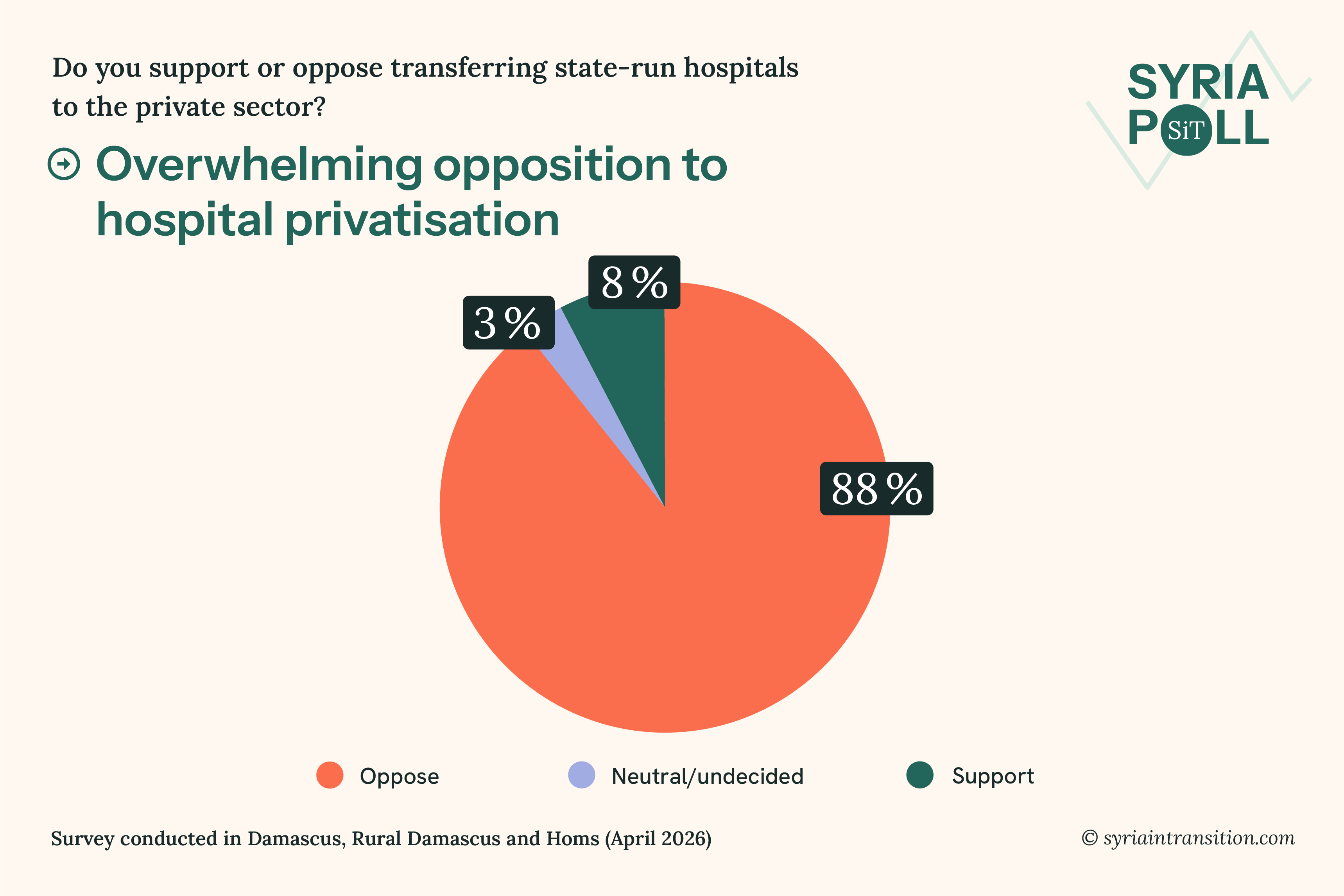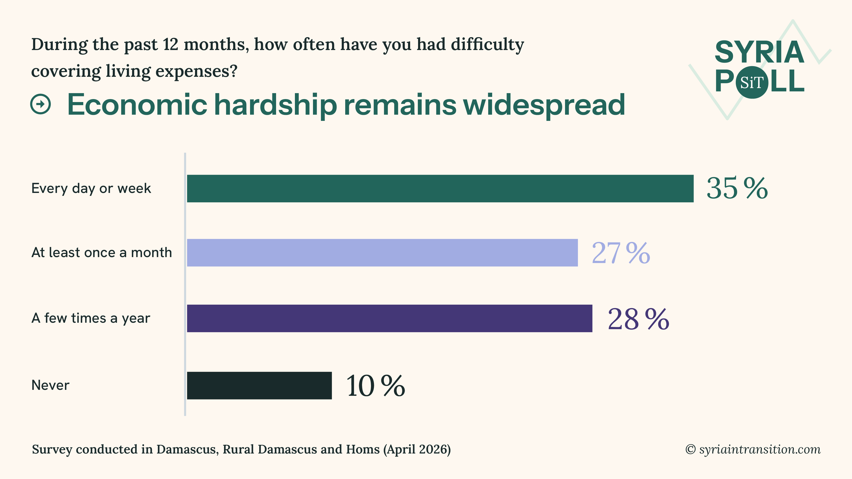 Welcome to the April wave of Syria Poll. This issue presents findings from surveys conducted in Damascus, Rural Damascus, and Homs in mid April 2026, examining how residents assess their living conditions, government performance, and recent political developments.