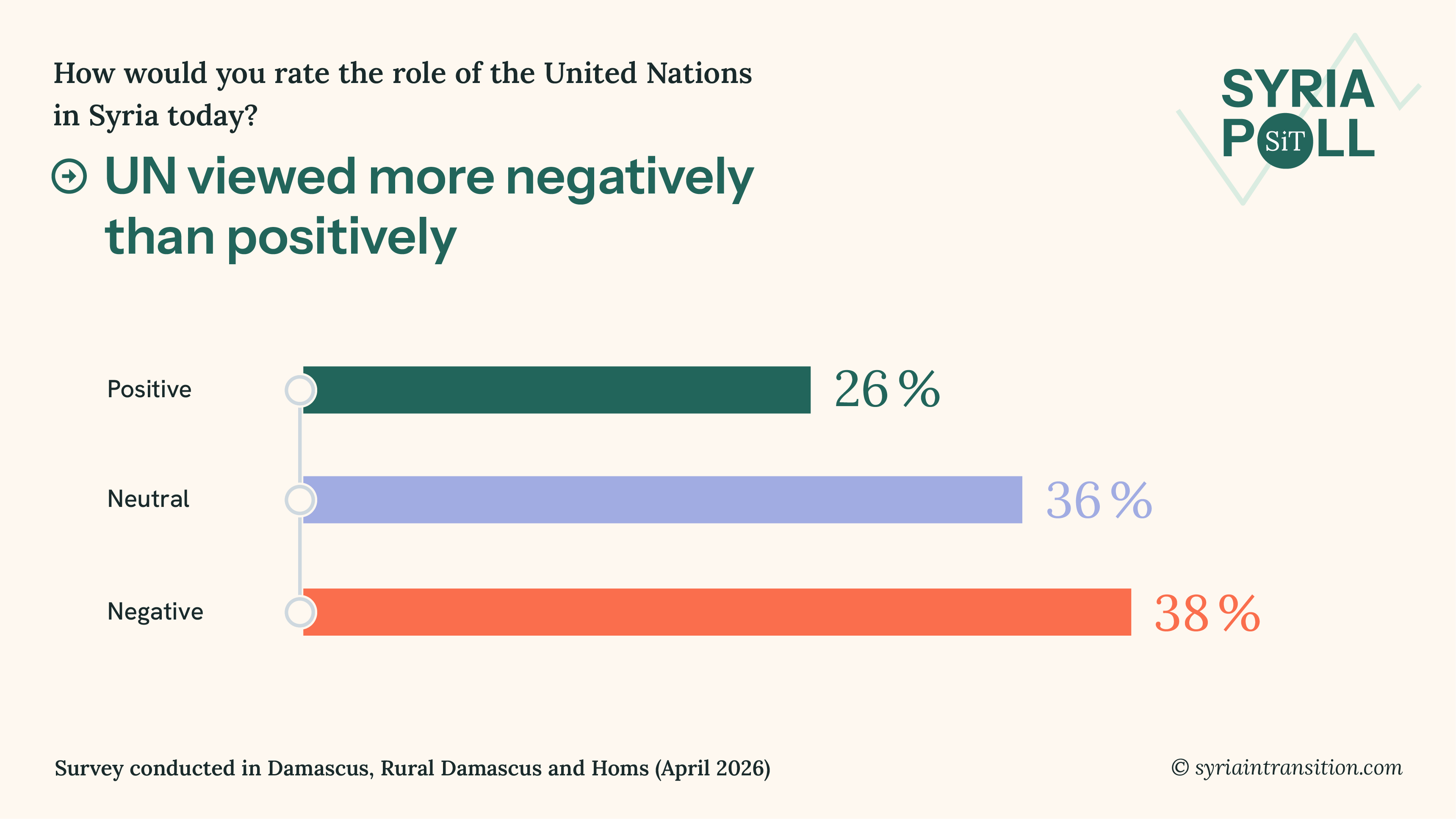 4. The UN plays multiple roles in Syria, from humanitarian assistance to political engagement. Overall, perceptions are mixed but lean negative. 38% rate the UN’s role negatively, compared to 26% who view it positively. A substantial 36% express neither a clearly positive nor negative view.