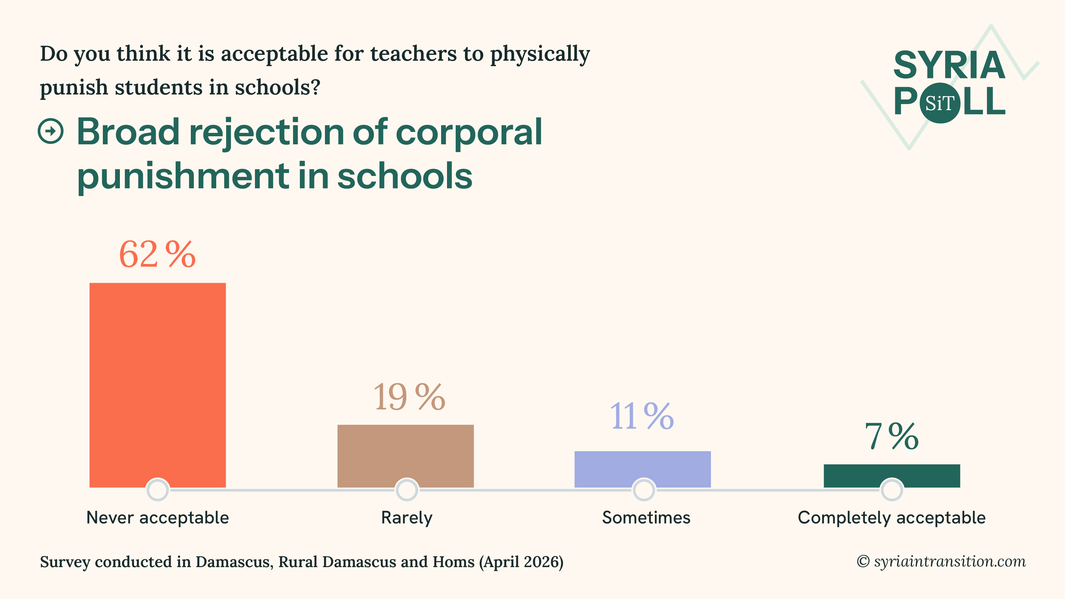 10. As Syria’s education system undergoes reform, attitudes toward discipline reflect changing norms. A majority of 62% say physical punishment in schools is never acceptable. Others express conditional acceptance, with smaller shares saying it is acceptable in some or all circumstances. The question forms part of an upcoming series on educational reform in Syria in Transition.