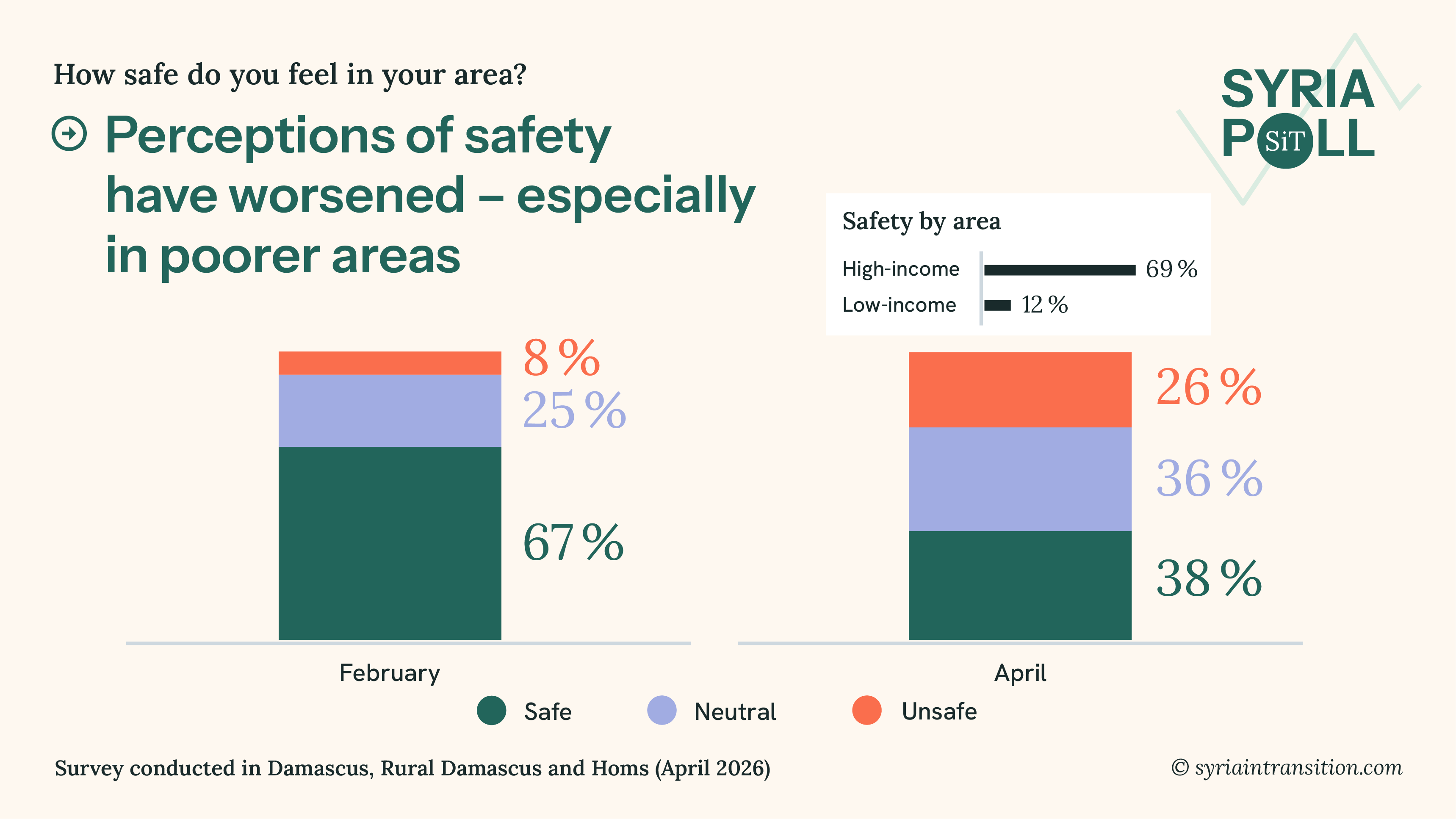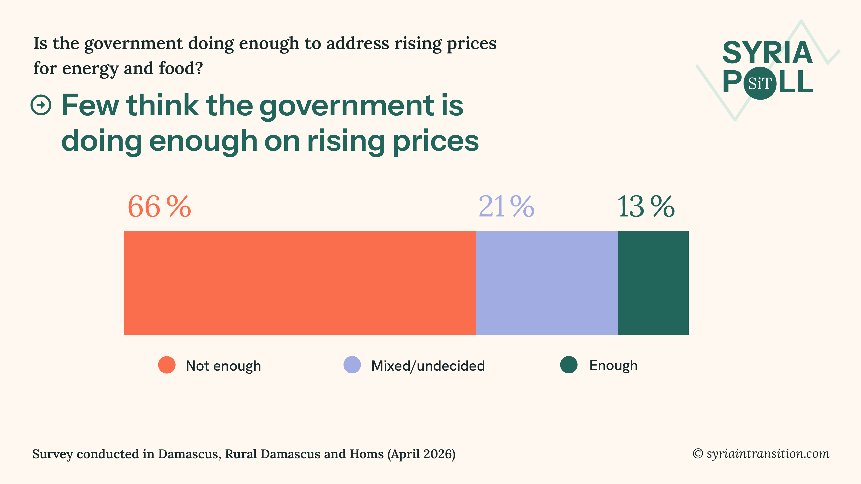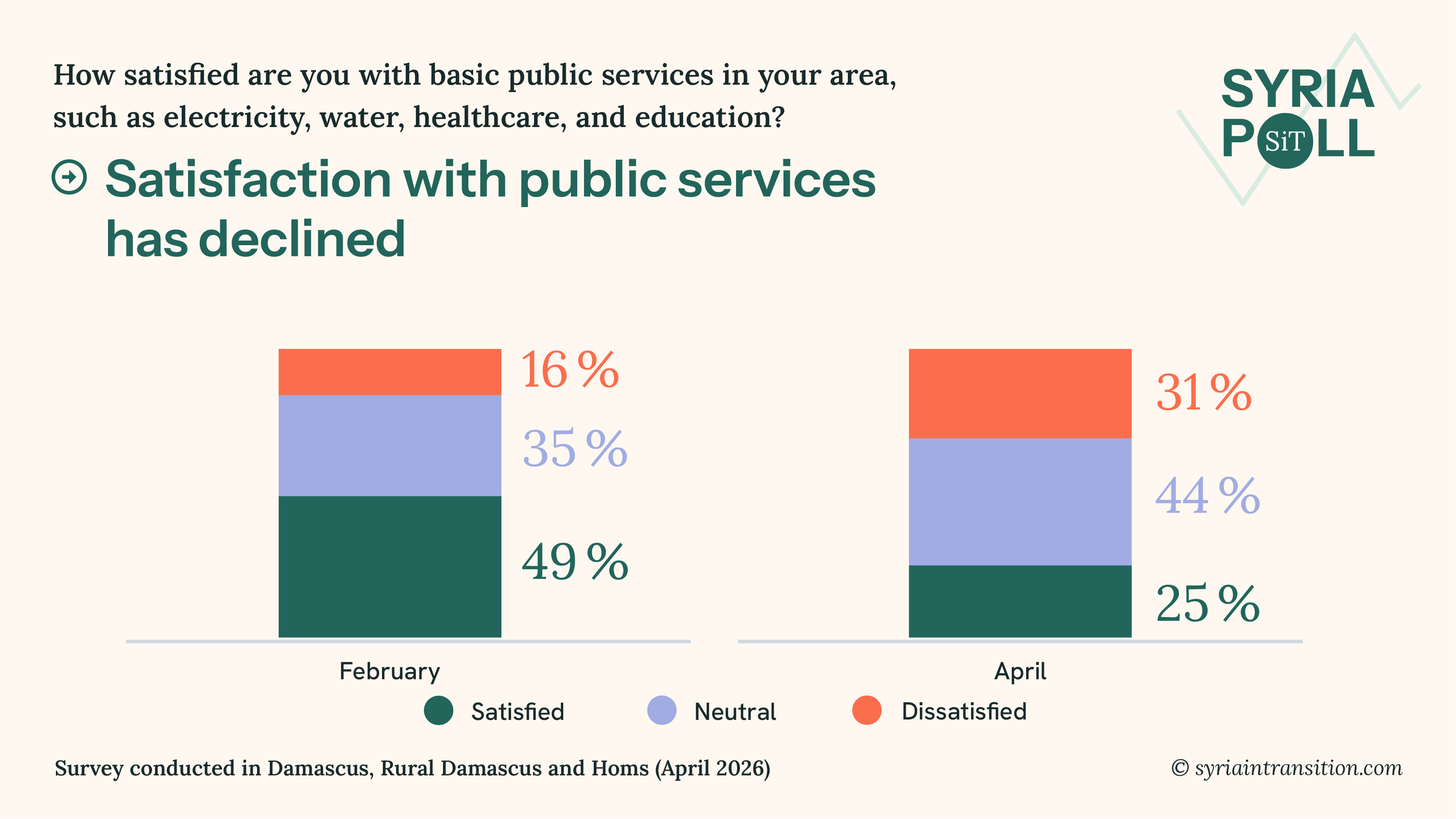 Welcome to the April wave of Syria Poll. This issue presents findings from surveys conducted in Damascus, Rural Damascus, and Homs in mid April 2026, examining how residents assess their living conditions, government performance, and recent political developments.