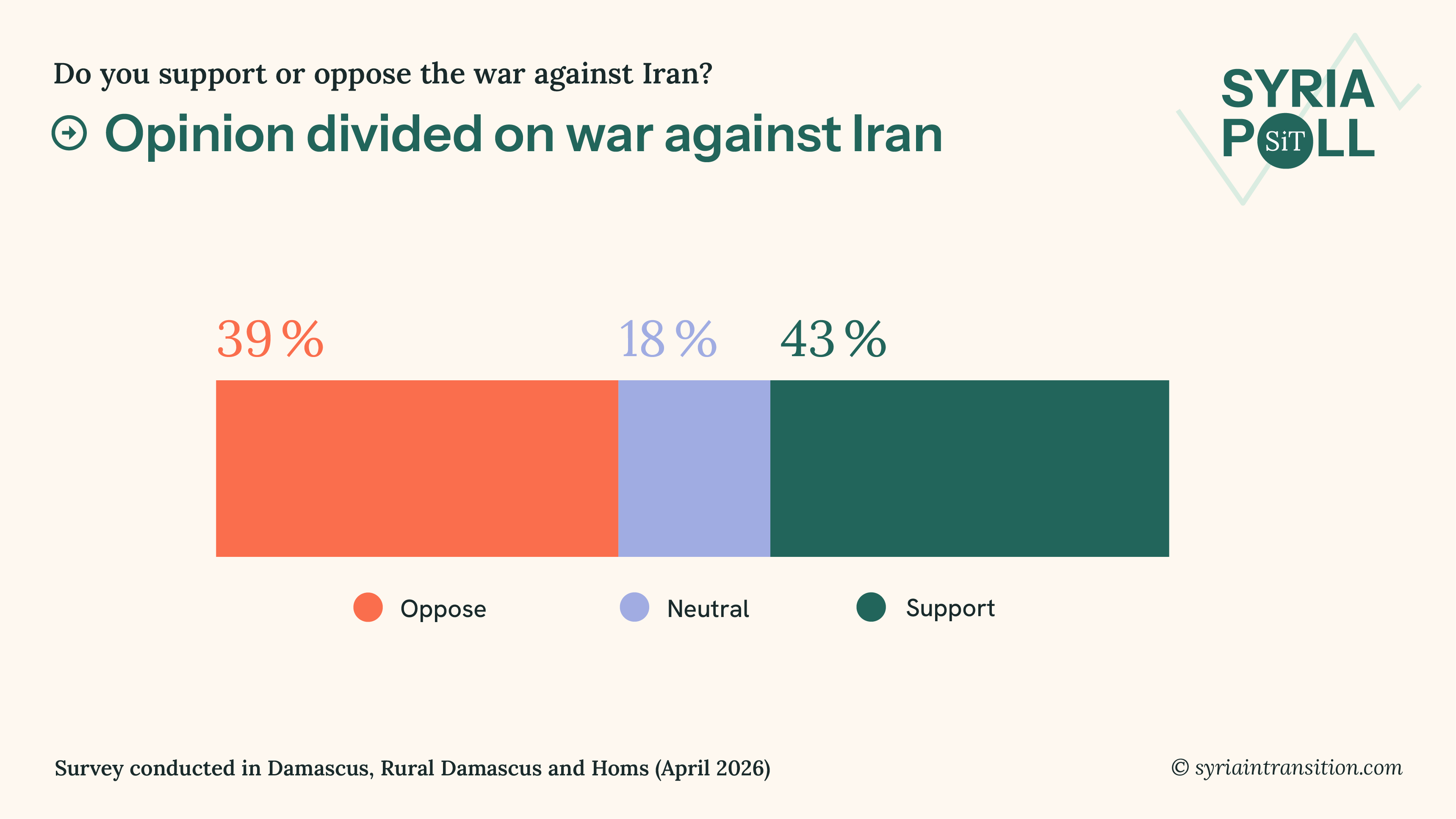 1. With Iran being a strong backer of the Assad regime, many respondents hold critical views of its regional influence. At the same time, opinion on the US-Israeli war against Iran is divided. 43% of respondents support it, while 39% oppose it. A further 18% remain undecided.