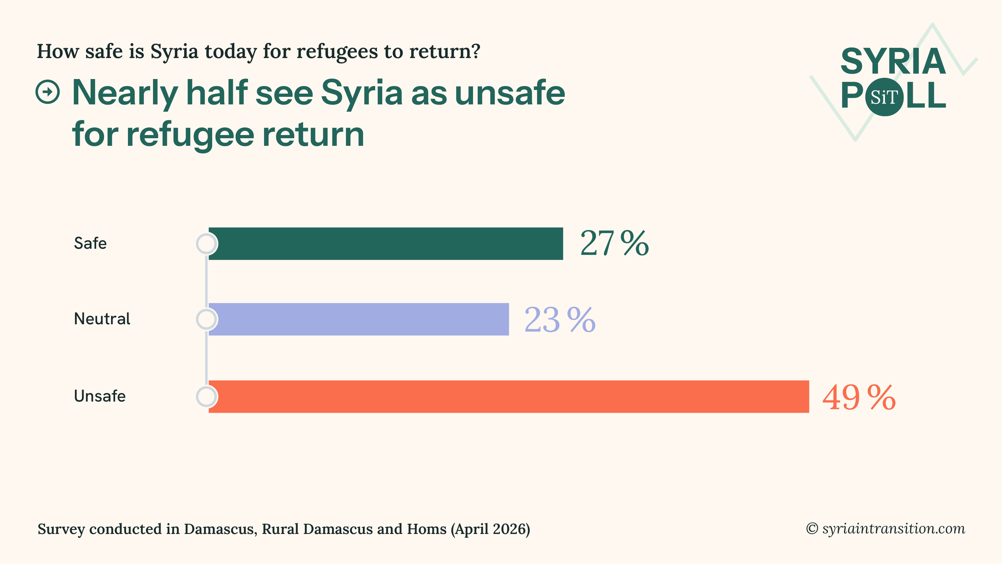 3. With millions of Syrians still living abroad, perceptions of return conditions remain cautious. 49% consider Syria unsafe for refugee return, while 27% say it is safe. The remainder take a more ambivalent position.