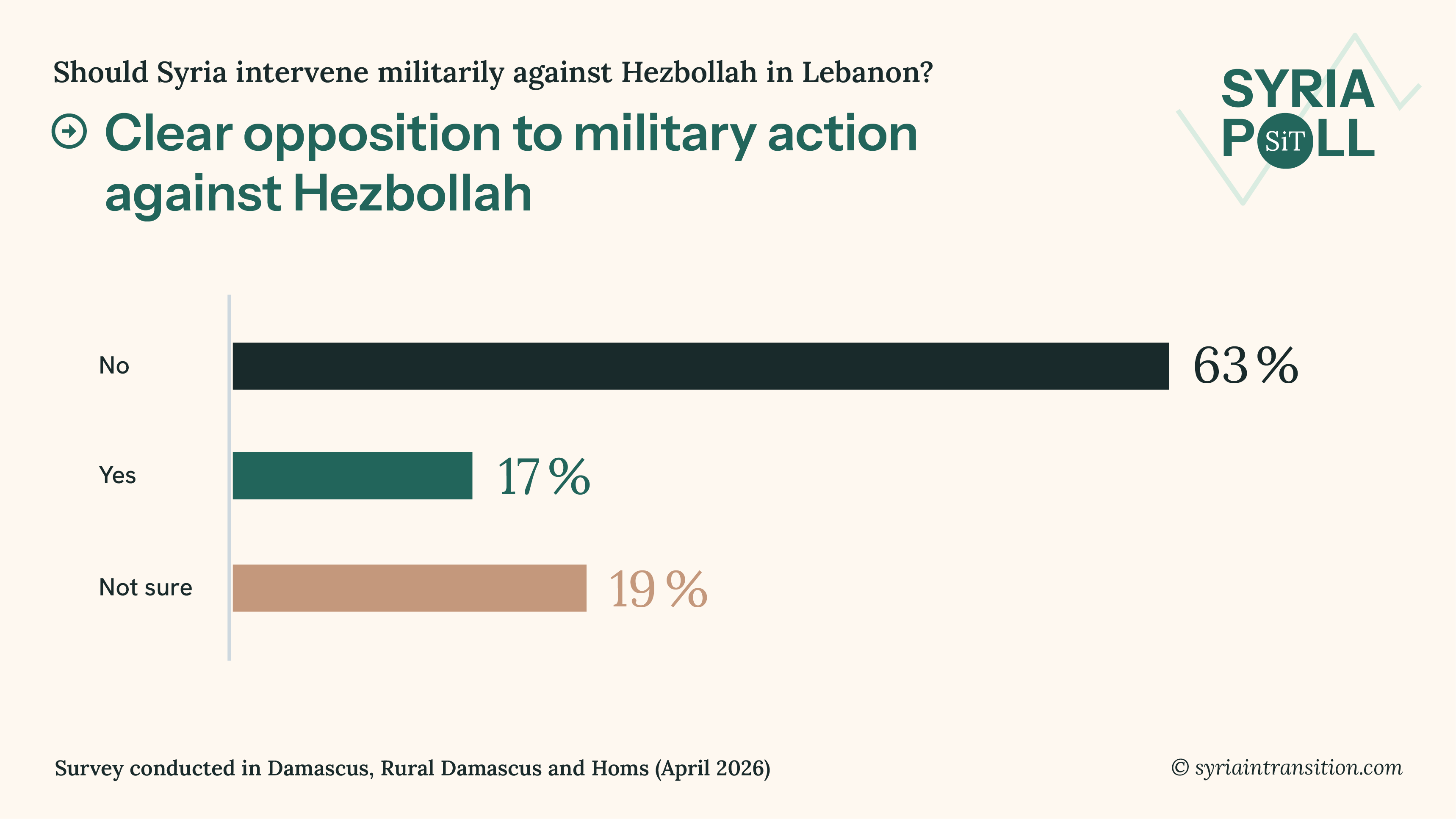 2. While views on the Iran war are split, there is clearer consensus on whether Syria should join the war. A majority of 63% opposes Syrian military intervention in Lebanon, while only 17% are in favour. Around one in five remain unsure.
